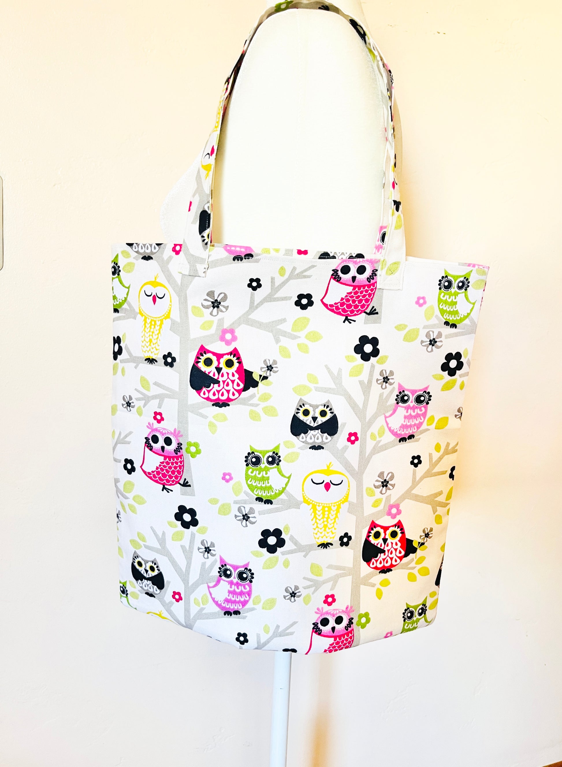 Cotton Canvas Tote Bag: Multi-Color Owls Print