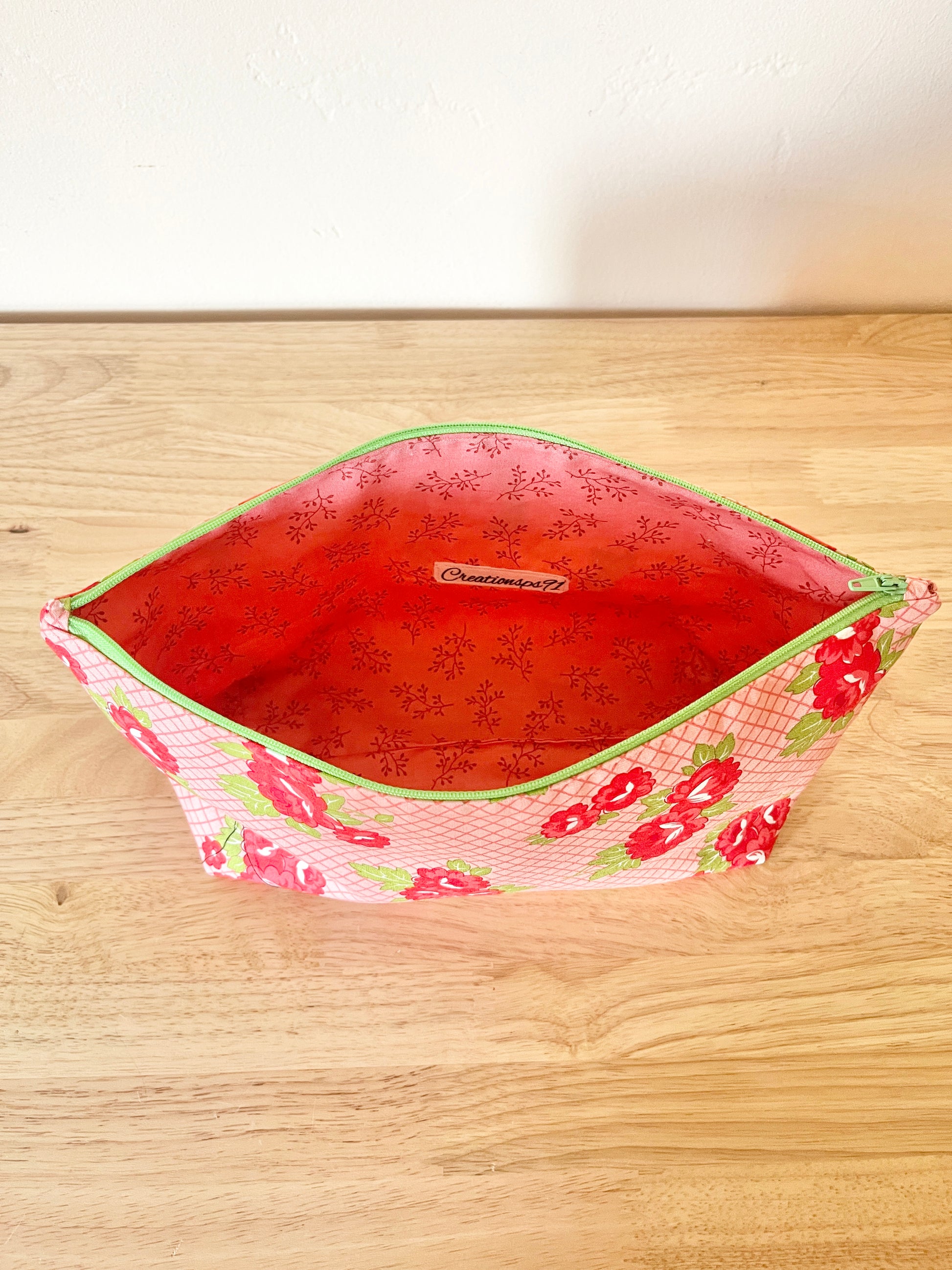 This handmade pouch measurements 13 1/2' wide, 6 1/2' tall, and 9 1/2' long